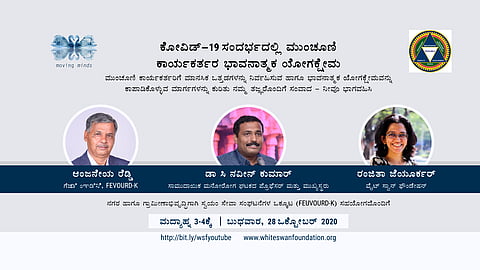 ಪ್ರಸ್ತುತ ಬಿಕ್ಕಟ್ಟಿನ ಸನ್ನಿವೇಶದಿಂದ ನಿಮ್ಮ ಭಾವನಾತ್ಮಕ ಮತ್ತು ಮಾನಸಿಕ ಆರೋಗ್ಯ ಹಾಗೂ ಯೋಗಕ್ಷೇಮದ ಮೇಲೆ ನಕಾರಾತ್ಮಕ ಪ್ರಭಾವ ಉಂಟಾಗುತ್ತದೆ ಎನ್ನುವುದನ್ನು ಮನಗಂಡು, ನಾವು ವೈಟ್ ಸ್ವಾನ್ ಫೌಂಡೇಷನ್ ವತಿಯಿಂದ ಒಂದು ಅಂತರ್ಜಾಲ ಸಮಾಲೋಚನೆ, ವೆಬಿನಾರ್ ಆಯೋಜಿಸಿದ್ದೇವೆ. ಕರ್ನಾಟಕದ ನಗರ ಮತ್ತು ಗ್ರಾಮೀಣಾಭಿವೃದ್ಧಿ ಸ್ವಯಂ ಸೇವಾ ಸಂಘಟನೆಗಳ ಒಕ್ಕೂಟ (FEVOURD-K) ದ ಸಹಯೋಗದಲ್ಲಿ ಈ ವೆಬಿನಾರ್ ಆಯೋಜಿಸಲಾಗಿದೆ.